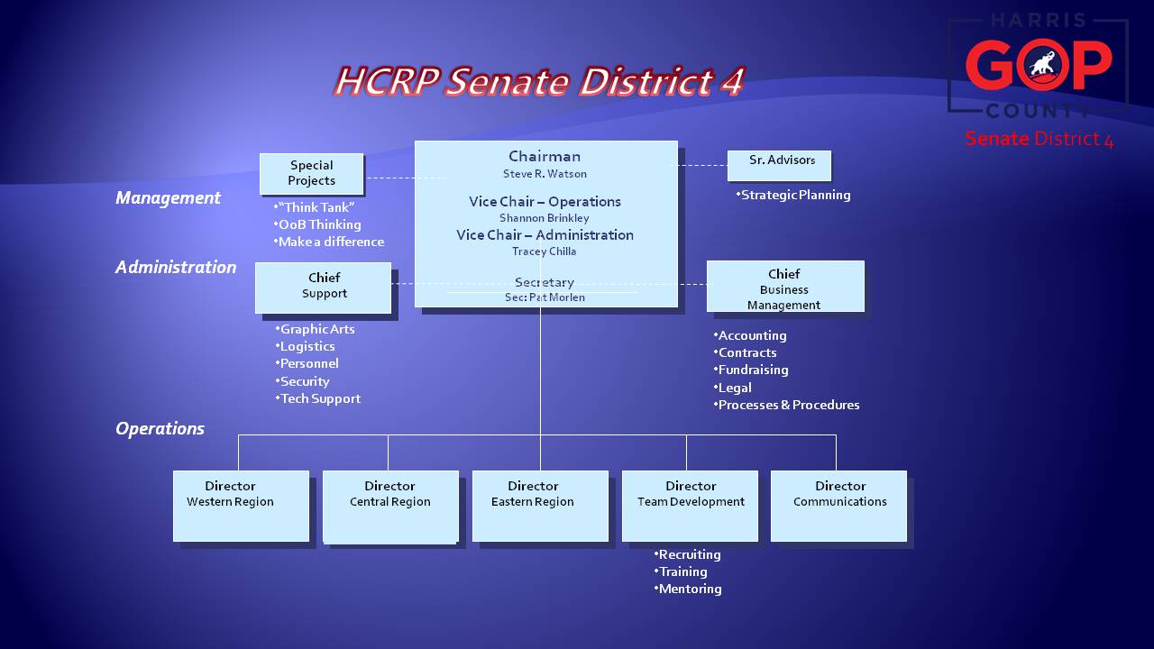 We are under the direct management of the Harris County Republican Party Senate District 4 Chairman,